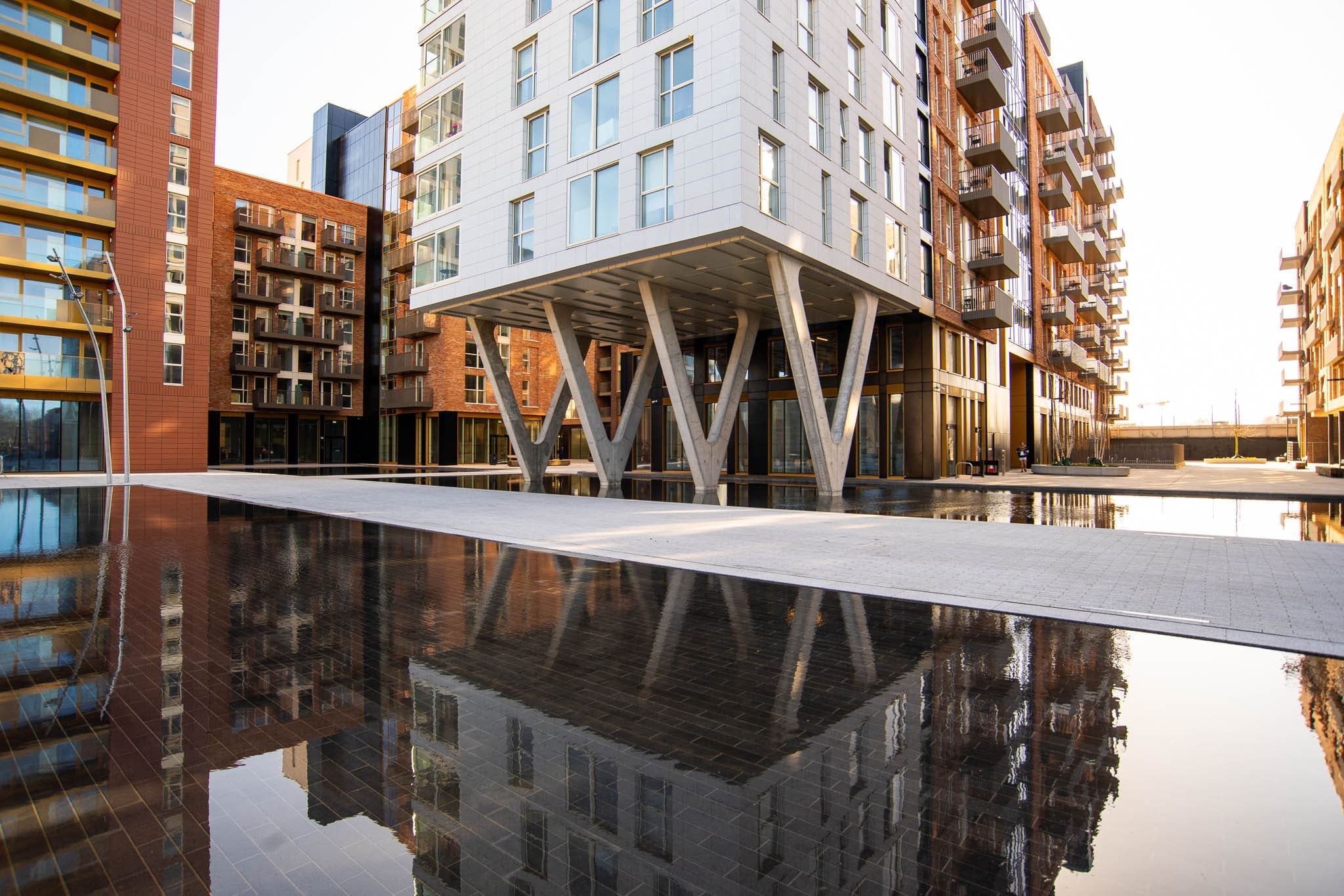 The basement and superstructure are of in-situ RC construction, with flat slab floor plates and cores and shear walls providing overall stability. A key feature of the development is the four 2-storey high reinforced concrete V Frames cast to the northern portion of Block 2 at Grand Canal Harbour which have been designed to support 7 residential levels and a roof terrace overhead. These architectural expressions of structure are a prominent feature at the epicentre of the overall development, occurring above a unique water feature and immediately facing the pedestrian thoroughfare and northern plaza.