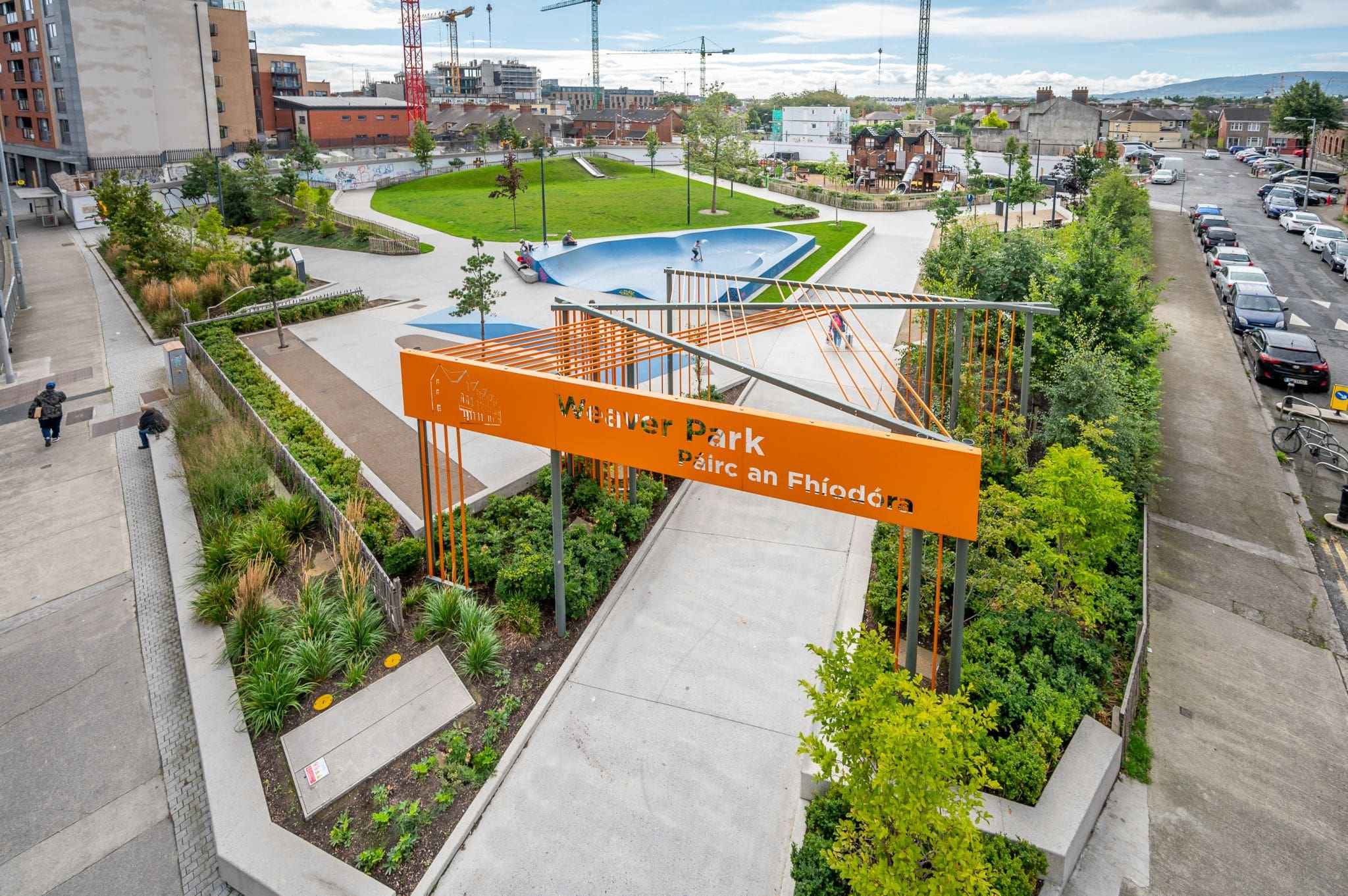 Weaver Park exemplifies sustainable urban design through biodiversity-rich planting, permeable green spaces for stormwater management, and durable low-maintenance materials. The previously vacant site was transformed into a vibrant public space, under the Liberties Greening Strategy, and integrates cultural heritage with modern amenities, fostering social inclusion and active community use. The park retained mature trees, introduced native species, and engaged stakeholders in co-design, creating a resilient, multifunctional space that enhances ecology, climate adaptation, and community well-being.